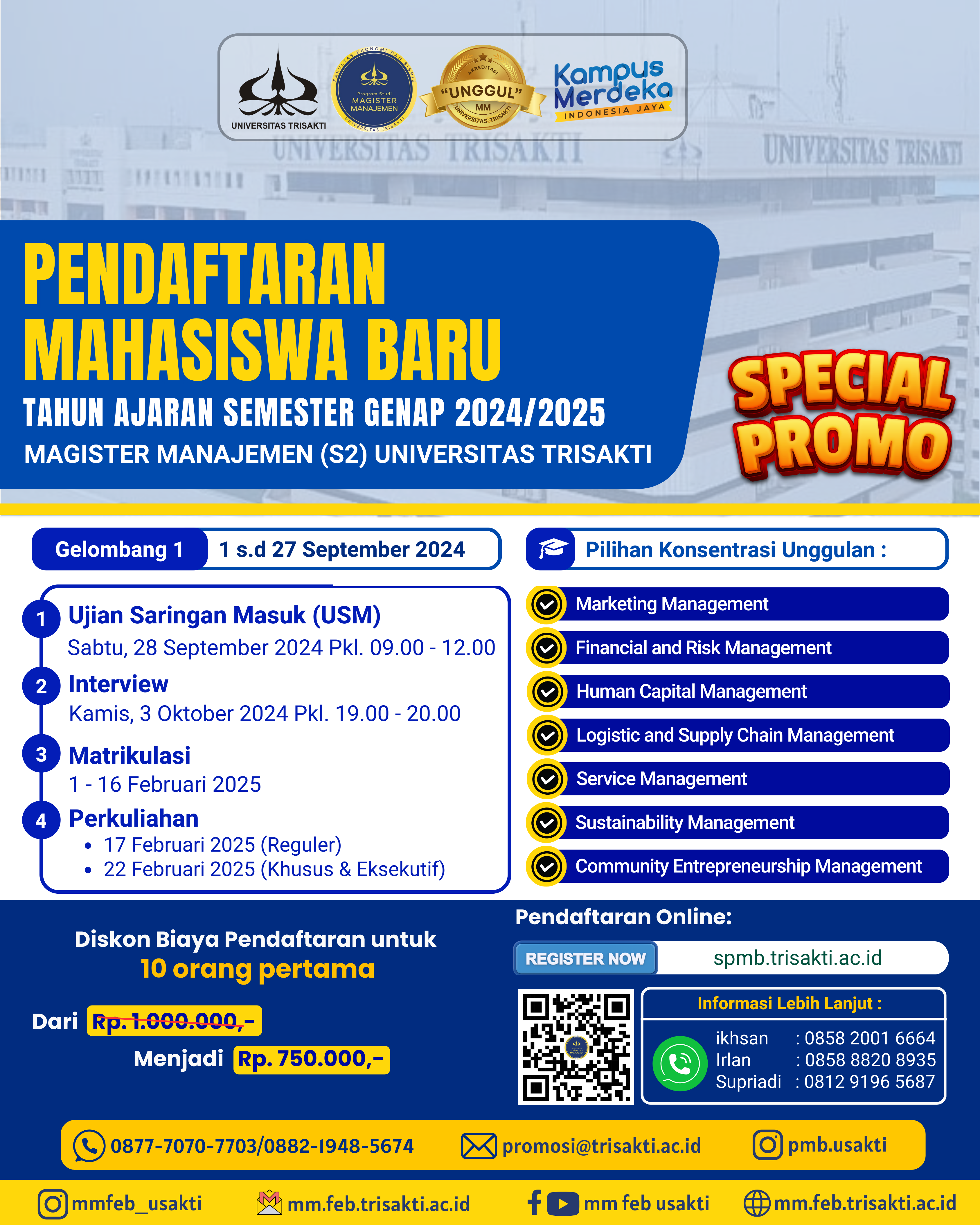 PENERIMAAN MAHASISWA BARU JENJANG MAGISTER MANAJEMEN (S2) Fakultas Ekonomi & Bisnis, Universitas Trisakti Jakarta, Semester Genap TA. 2024/2025 melalui jalur Gelombang 1 (Satu)
