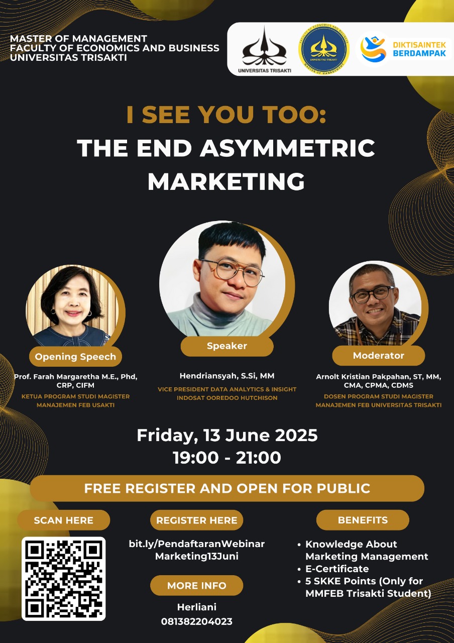 Yuk Jangan lewatkan kesempatan untuk ikut serta dalam webinar eksklusif Universitas Trisakti dengan tema “I See You Too: The End Asymmetric Marketing”