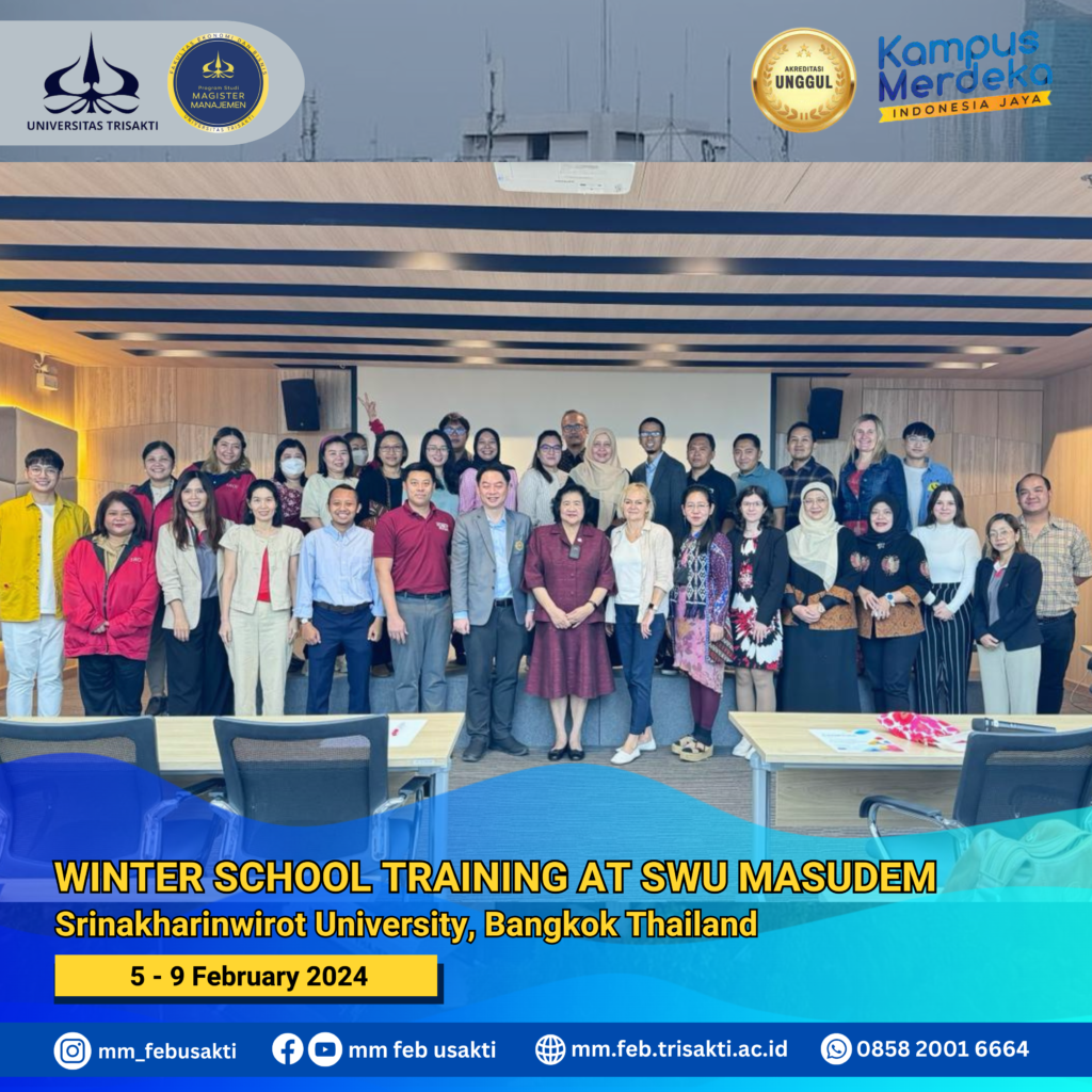 Master of Management Faculty of Economics and Business Trisakti University (MM FEB USAKTI) sent a delegation to attend the Winter Course of Curriculum Development for Master Studies in Sustainable Development and Management (MASUDEM) funded by Erasmus + European Union, at Srinakharinwirot University, Bangkok, Thailand on February 5 to 9, 2024. The delegation members consisted of four lecturers from the MM FEB study program at Trisakti University, namely
