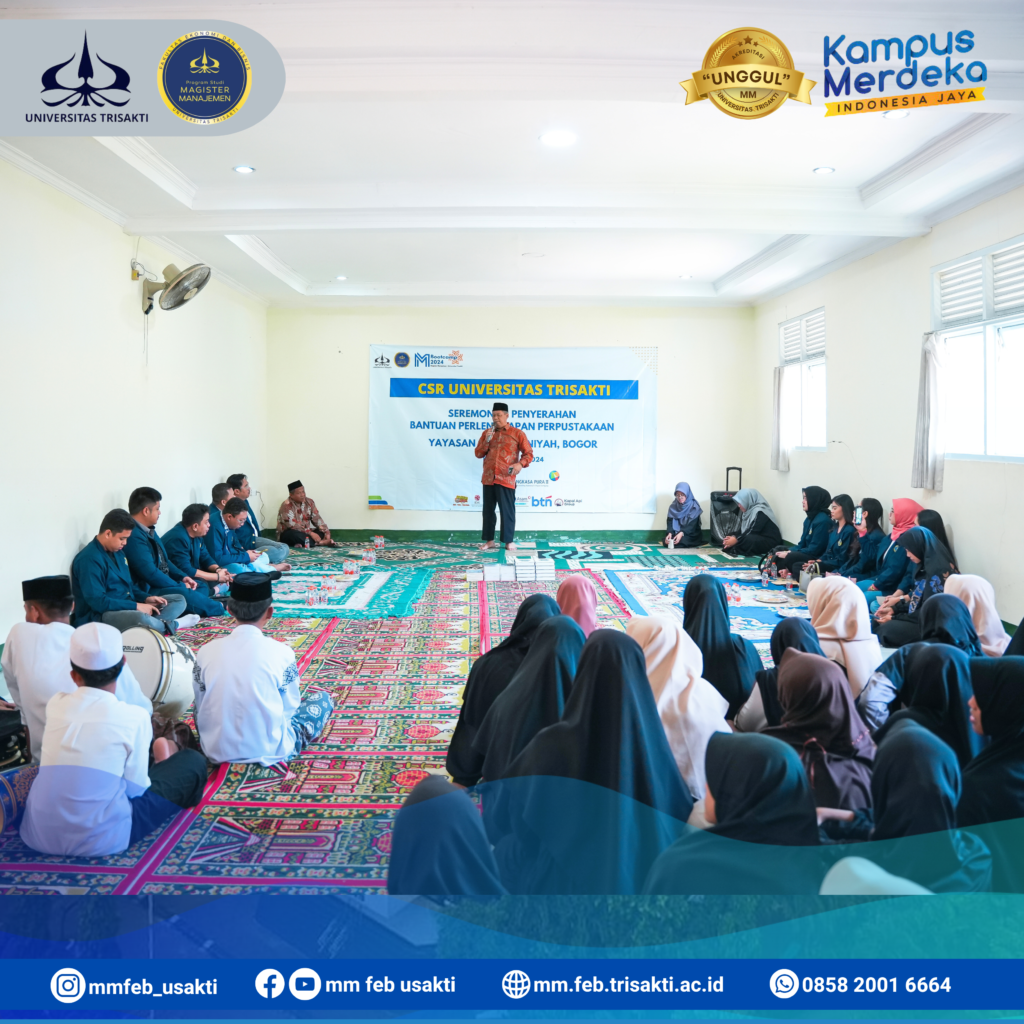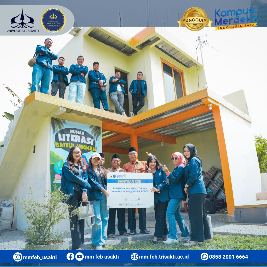 The construction of a reading house is a CSR program of the Master of Management, Faculty of Economics and Business, Trisakti University in MM Bootcamp activities in 2024 which is supported by various companies, one of which is PT Angkasa Pura II which was carried out on August 18, 2024 located at the Al Furqoniyah Islamic Boarding School Foundation, Bogor, West Java with a total of 523 students.