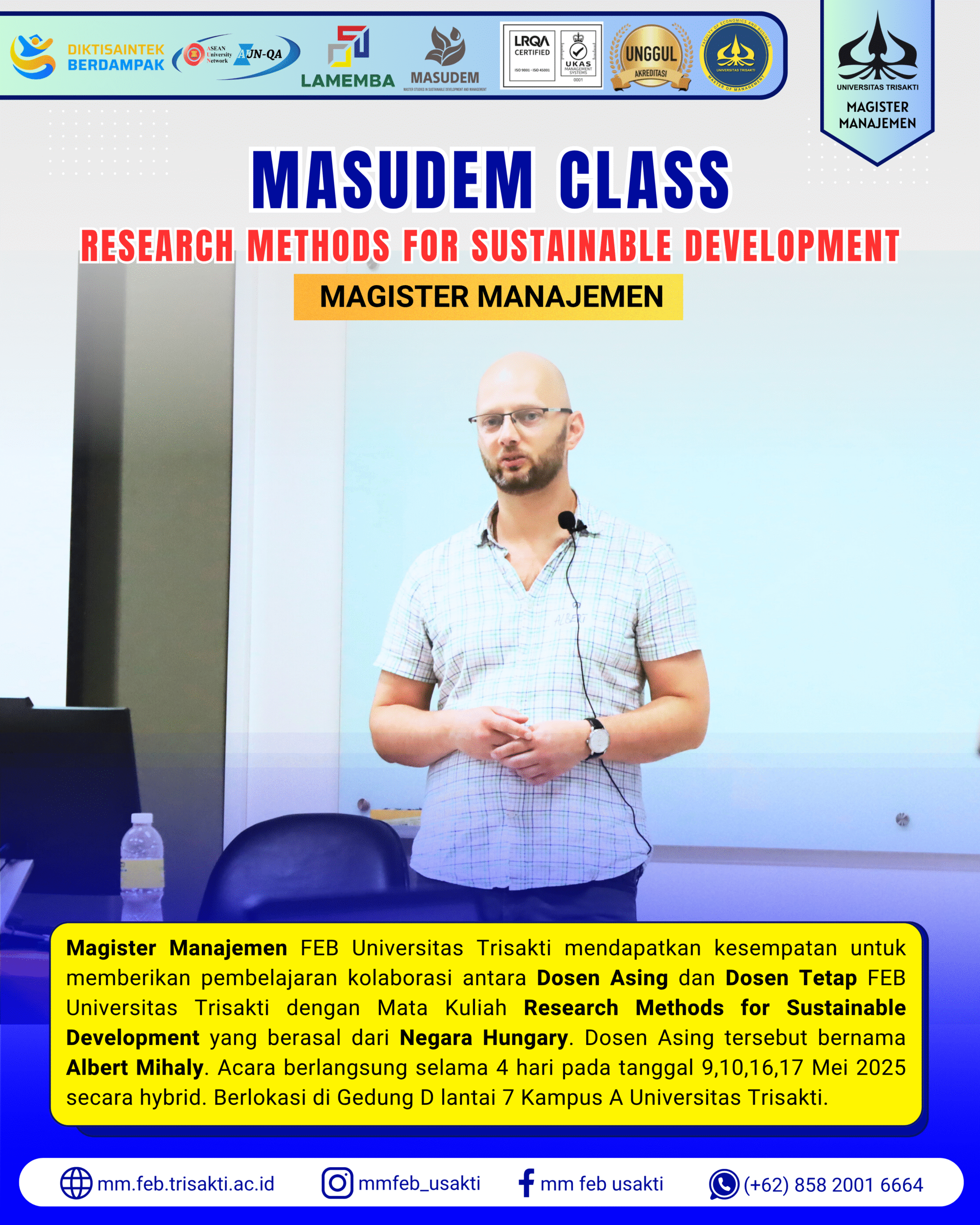 Magister Manajemen FEB Universitas Trisakti mendapatkan kesempatan untuk memberikan pembelajaran kolaborasi antara Dosen Asing dan Dosen Tetap FEB Universitas Trisakti dengan Mata Kuliah Research Methods for Sustainable Development yang berasal dari Negara Hungary. Acara berlangsung selama 4 hari pada tanggal 9,10,16,17 Mei 2025 secara hybrid. Berlokasi di Gedung D lantai 7 Kampus A Universitas Trisakti.