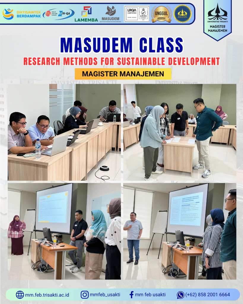 Mata Kuliah Research Methods for Sustainable Development merupakan salah satu mata kuliah yang akan dikontrak oleh mahasiswa semester 3. Bedanya, untuk semester ini, Prodi Magister Manajemen FEB Universitas Trisakti bekerja sama dengan MASUDEM (Master Studies in Sustainable Development and Management) untuk memberikan materi tersebut sehingga proses perkuliahan ini akan memiliki materi kajian yang berbeda, terutama mengenai konsentrasi Sustainability Management yang berlaku di Indonesia dan luar negeri.