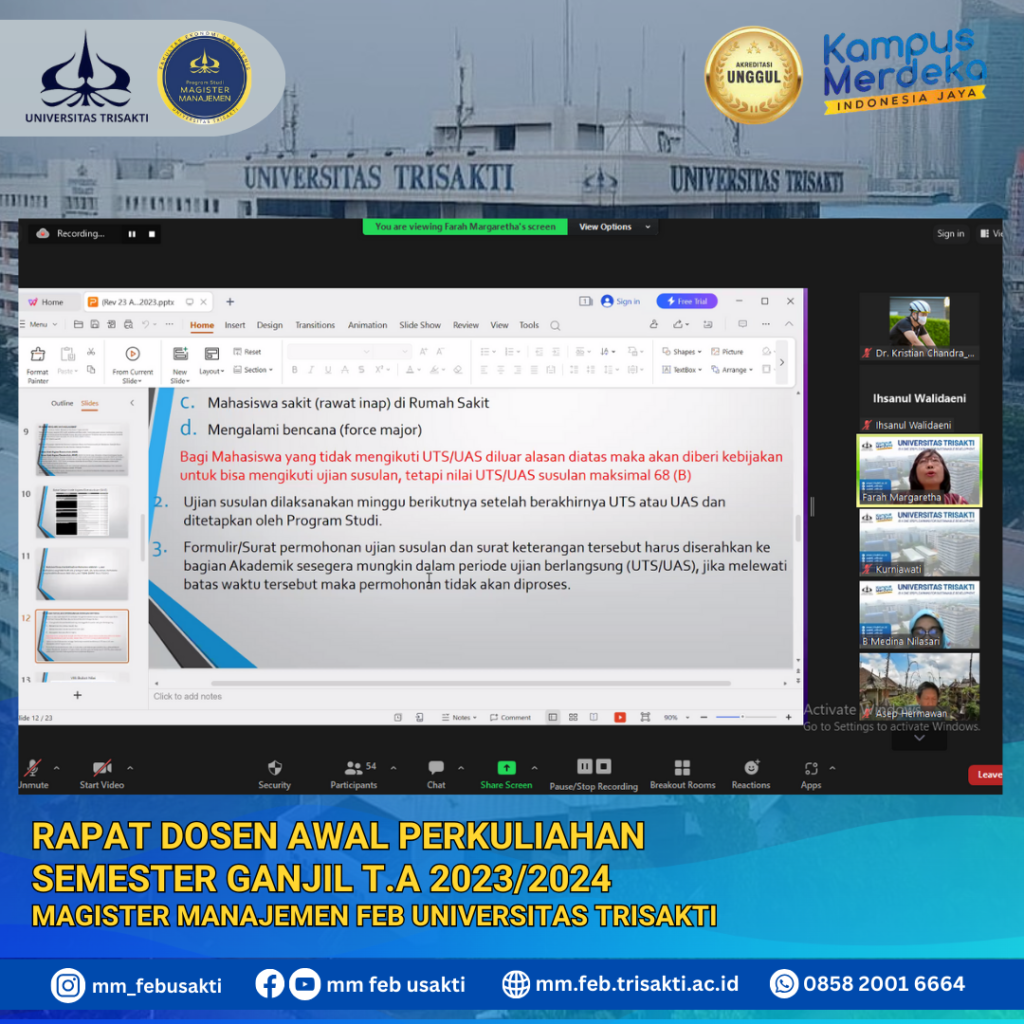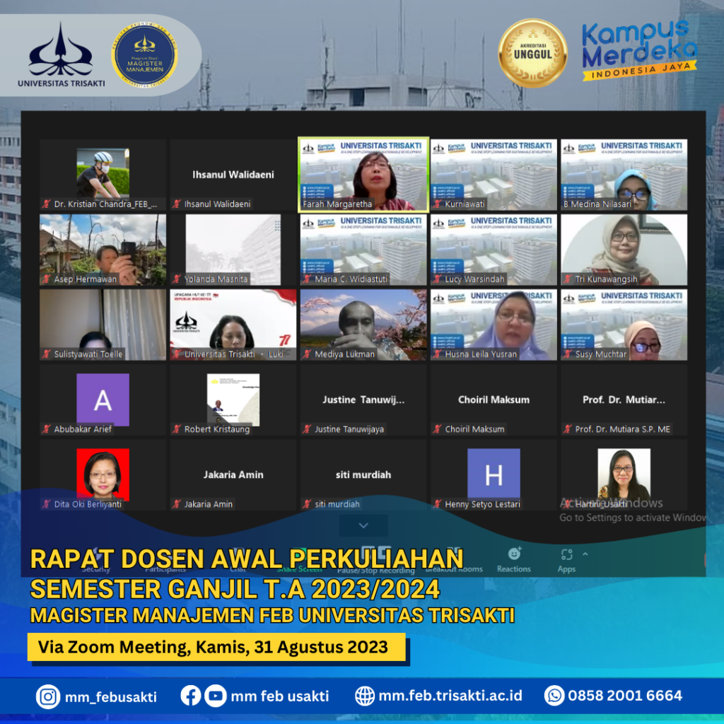 Memasuki awal perkulihan Semester ganjil tahun akademik 2022/2023, Program Studi Magister Manajemen Fakultas Ekonomi dan Bisnis Universitas Trisakti melaksanakan rapat awal semester ganjil ini untuk membahas persiapan perkuliahan semester ganjil Tahun Akademik 2023/2024 Melalui Zoom Meeting.