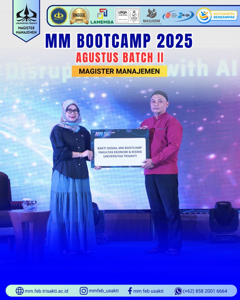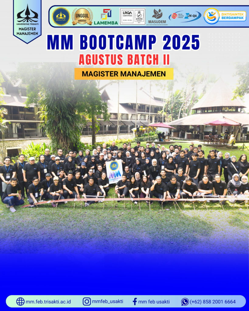 Program Studi Magister Manajemen Fakultas Ekonomi dan Bisnis Universitas Trisakti menyelenggarakan MM Bootcamp 2025 Batch 2 pada tanggal 23 dan 24 Agustus 2025 yang berlokasi di Novotel Bogor Golf Resort and Convention Center. Kegiatan ini merupakan kegiatan rutin yang dilakukan setiap tahun 2 kali pada program MM FEB Trisakti dengan tujuan untuk memfasilitasi pembekalan serta menampung dan merealisasikan ide, inovasi dan bentuk kerjasama bagi mahasiswa program studi magister manajemen universitas Trisakti